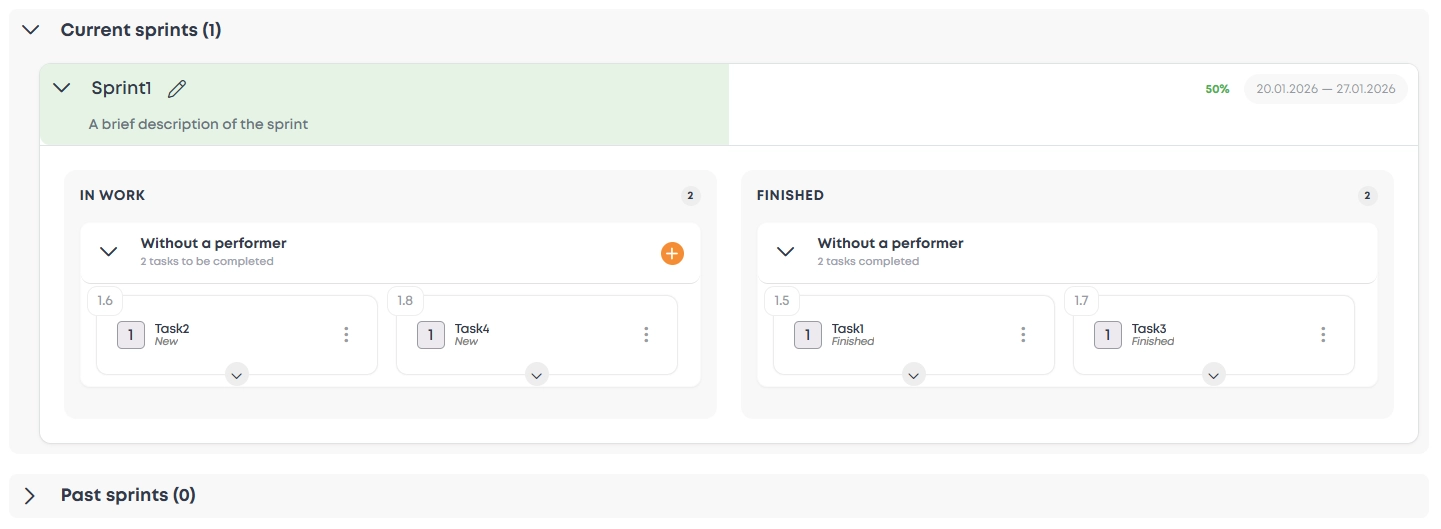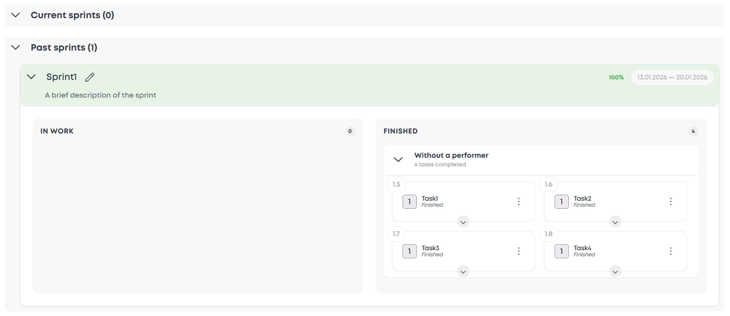 Sprints Service helps the team focus on tasks that need to be completed within a limited period of time (sprint). It allows planning work, tracking progress, and accounting for automatically calculated results.